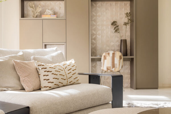 Een compleet nieuw design voor een woonkamer. Begonnen met een 3D-tekening en uniek ontwerp, vervolgens de realisatie van het project. Deze high-end woning in Veldhoven kreeg een volledige make-over met op maat gemaakte meubels, serene beige tinten, zachte materialen en een glam touch.